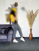 - ویژگیها: دارای کش در پشت کمر و دو دکمه با زیپ در قسمت جلو، طرح زاپ دارد اما بدننما نیست و فاق بلندی دارد که جلوهای خاص به پوشش میبخشد.