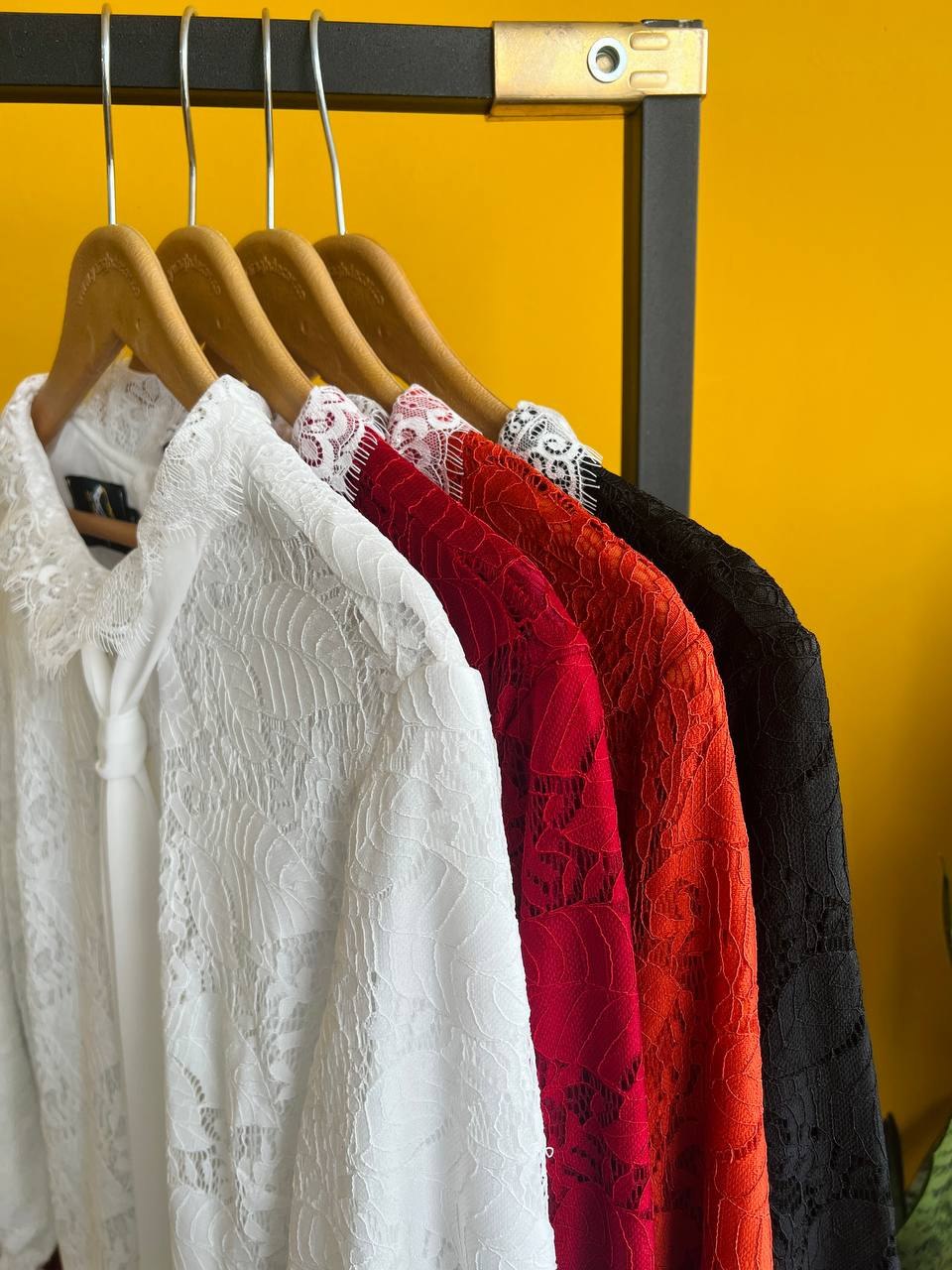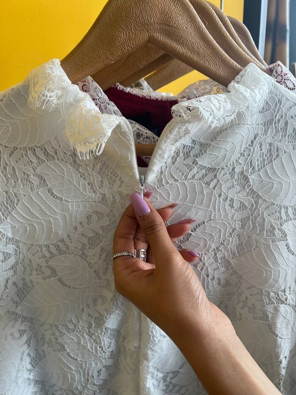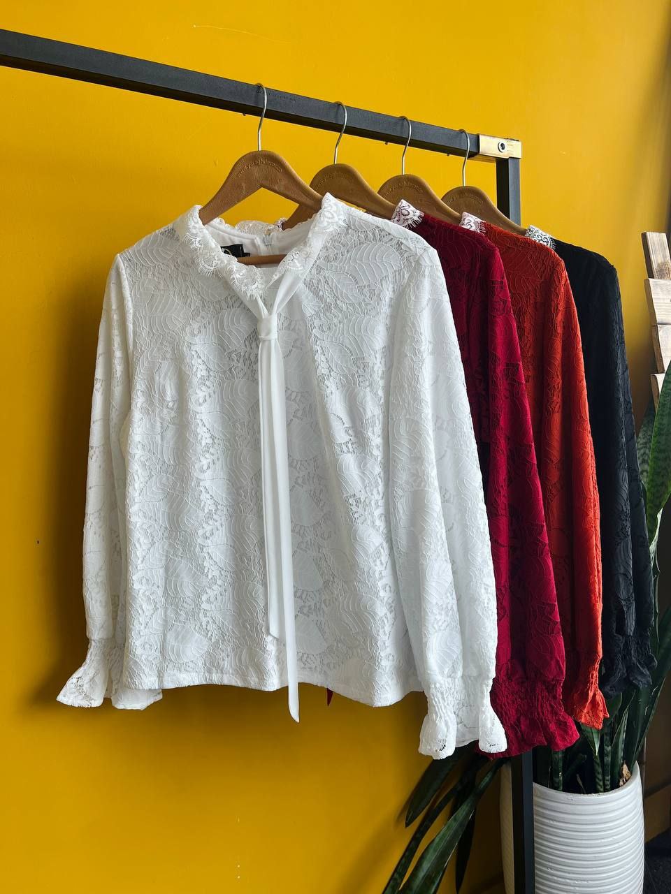 - ویژگیها: بلوز دارای آستر، سرآستین کشدار، یقه با طراحی تور سفید و بند، و زیپ در قسمت پشت است.